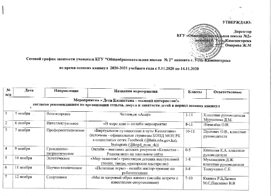 2020-2021 оқу жылының күзгі каникул кезінде 05.11.2020 бастап 14.11.2020 дейін оқушыларды жұмыспен қамтудың желілік кестесі. Сетевой график занятости учащихся во время осенних каникул 2020-2021 учебного года с 05.11.2020 по 14.11.2020 » Коммунальное государственное учреждение "Общеобразовательная школа №2" акимата г.Усть-Каменогорска