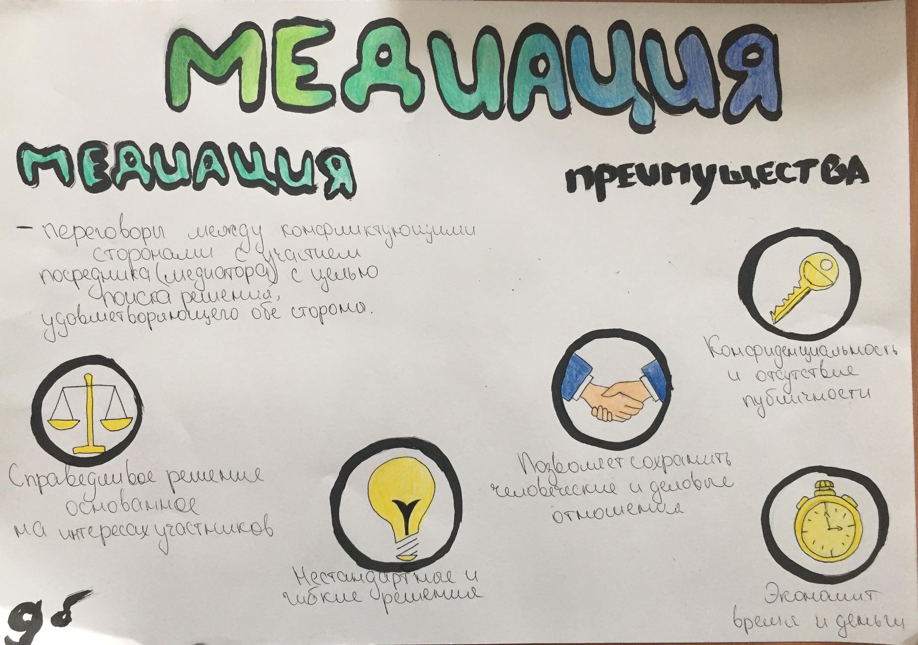 - «Жанжал және оны шешу» суреттер конкурсы (4-7 сыныптар), мектеп медиациясы қызметінің логотипі конкурсы(8-11сыныптар);