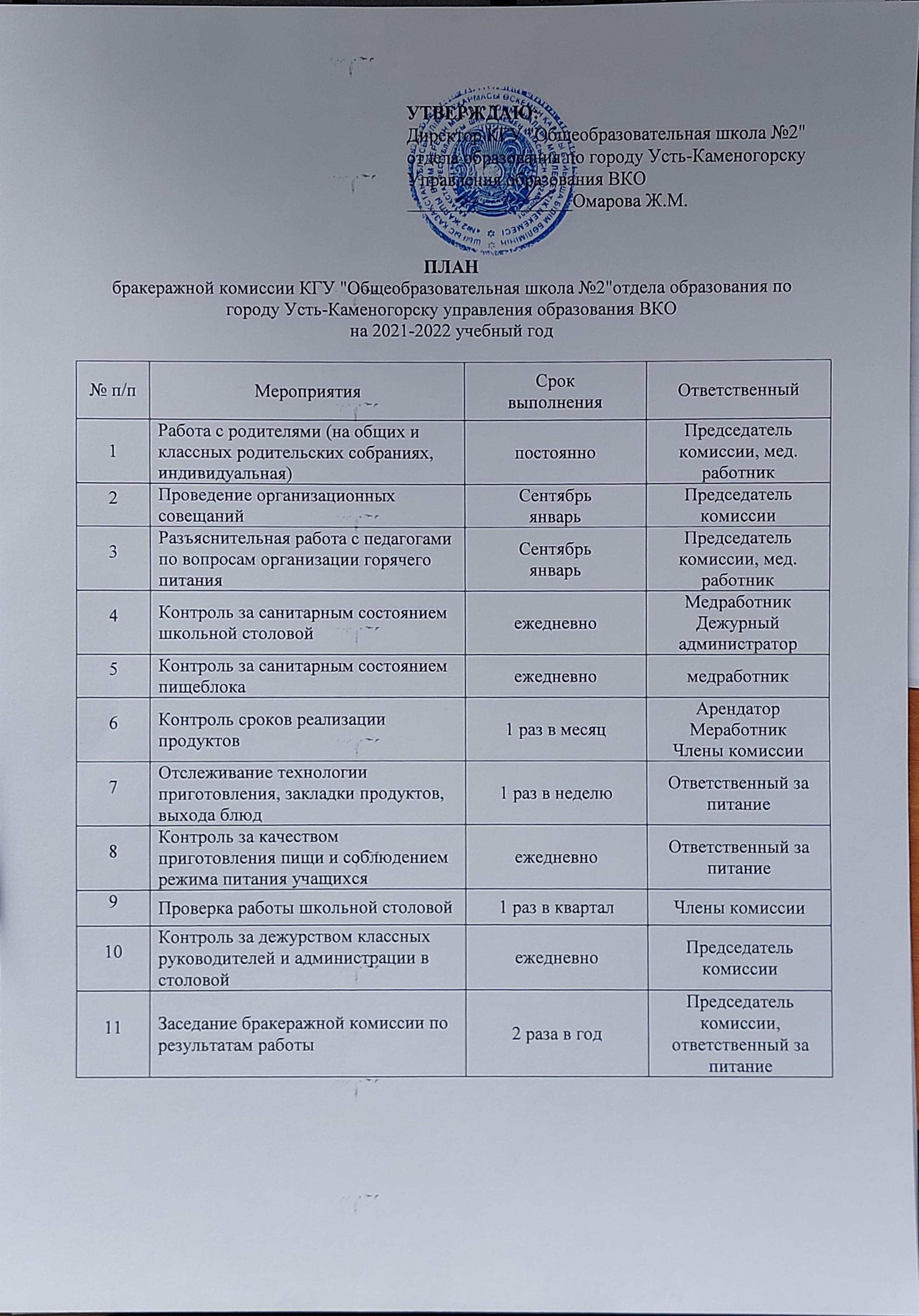 План работы бракеражной комиссии » Коммунальное государственное учреждение "Общеобразовательная школа №2" акимата г.Усть-Каменогорска