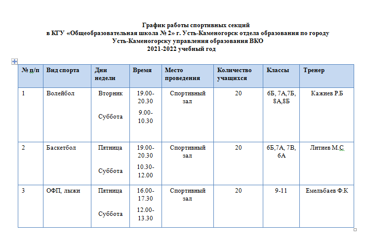 График работы спортивных секций » Коммунальное государственное учреждение "Общеобразовательная школа №2" акимата г.Усть-Каменогорска