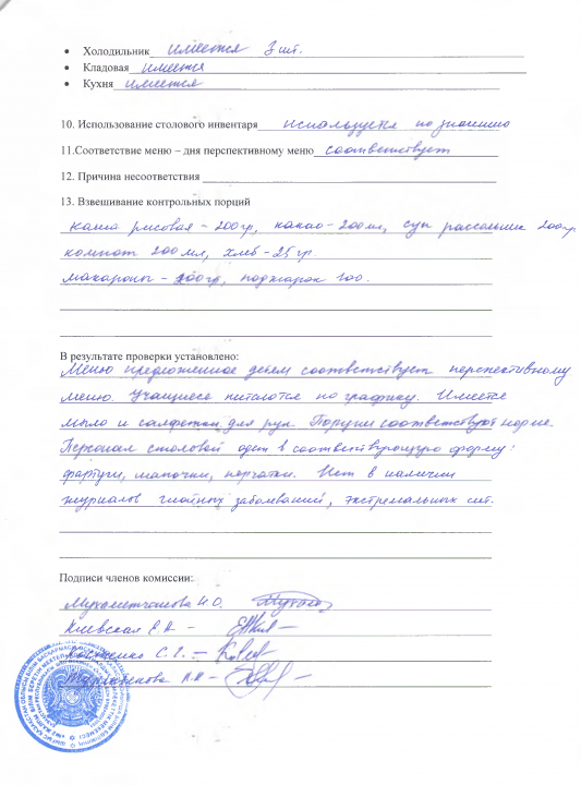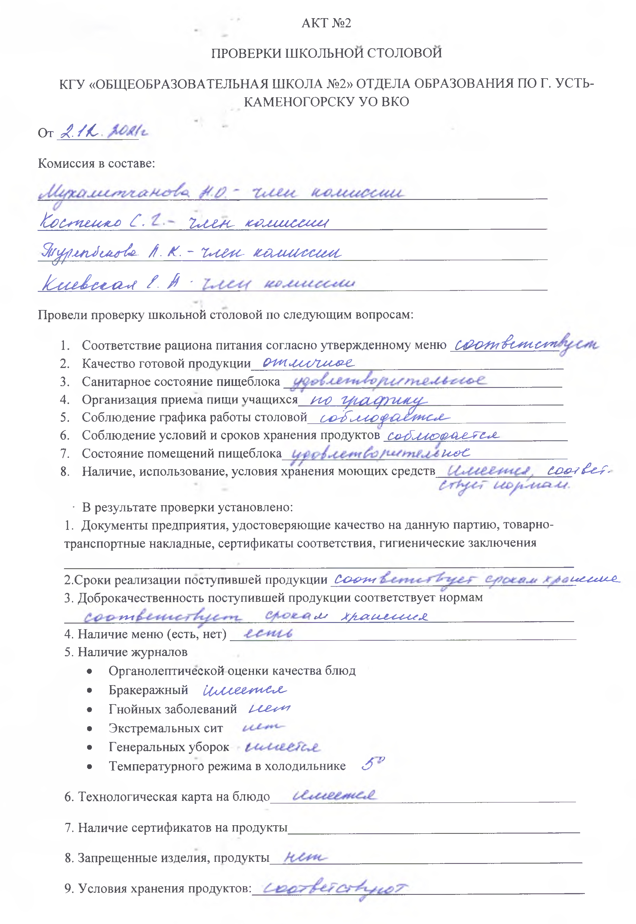 Акт №2 по проверке школьной столовой » Коммунальное государственное учреждение "Общеобразовательная школа №2" акимата г.Усть-Каменогорска