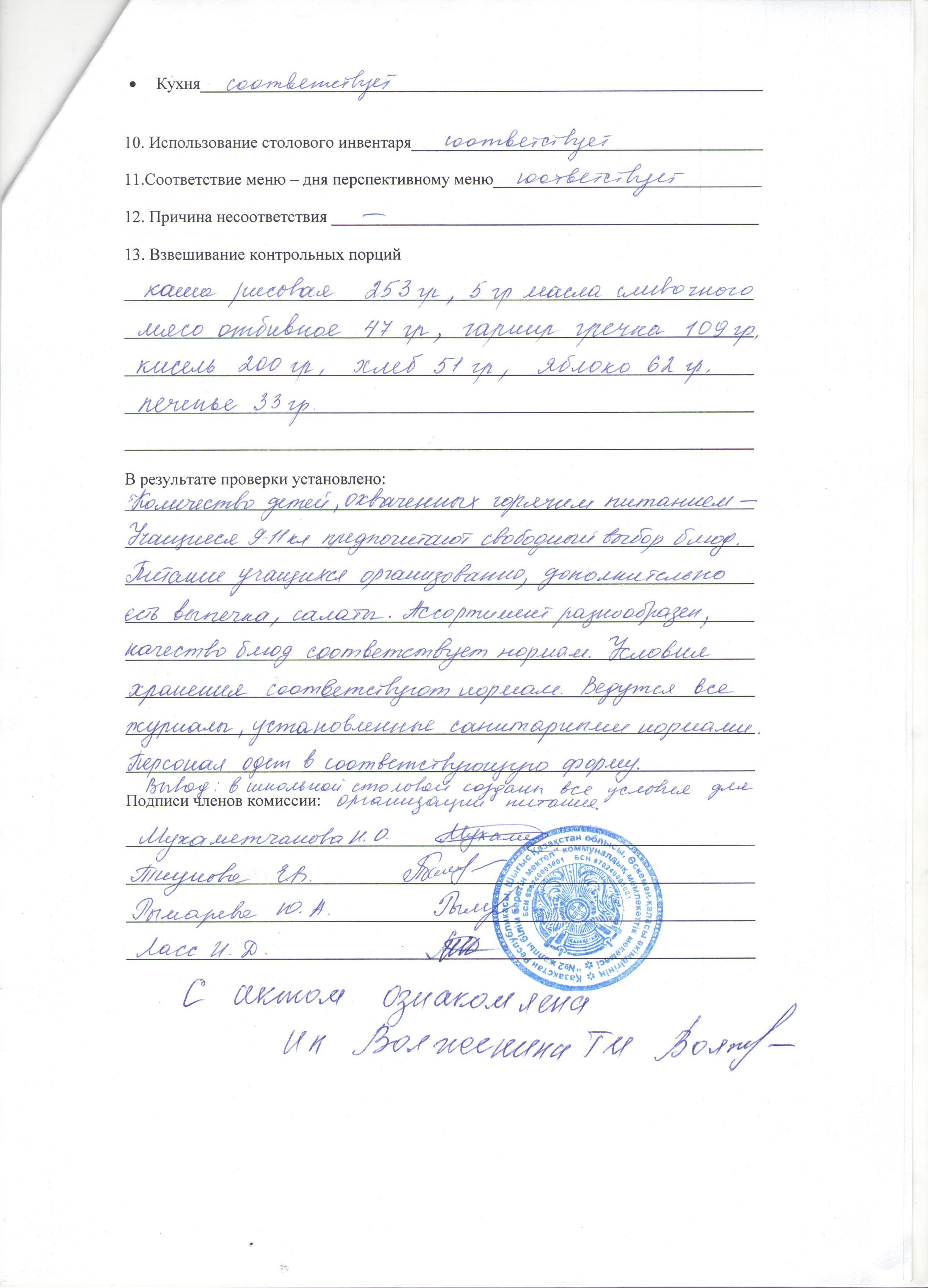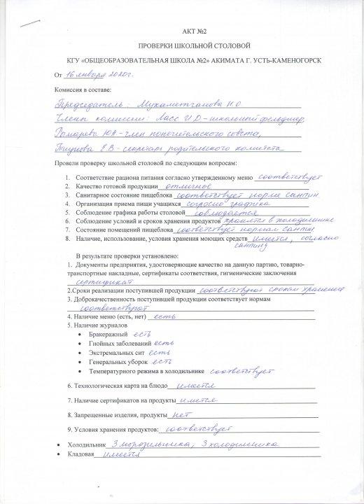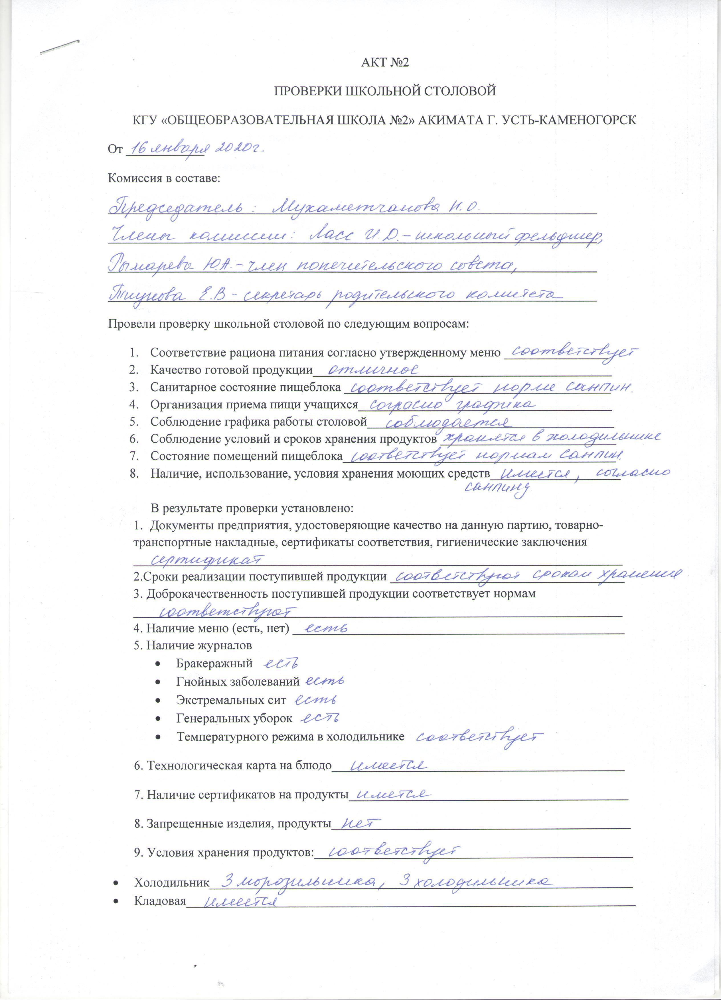 2020 жылдың 16 қаңтарында мектеп асханасында бракеражды комиссиямен тексеріс жүргізілді, тексеріс барысында акт жасалынды.