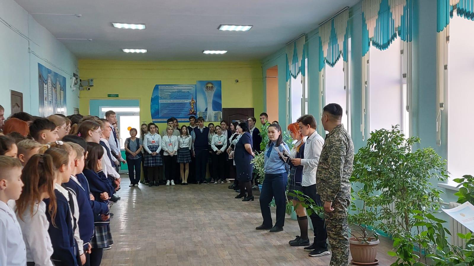 19 қыркүйекте жалпы мектепішілік лездеме өтті.Лездемеде мектеп инспекторы құқық бұзушылықтардың алдын-алу туралы,шылым шегудің зияны және жол қауіпсіздігі туралы түсіндірме жұмысын жүргізді. 19 сентября состоялась общешкольная линейка, на линейке присутствовал школьный инспектор который рассказал о профилактике правонарушений, о вреде курения и правилах дорожного движения.
