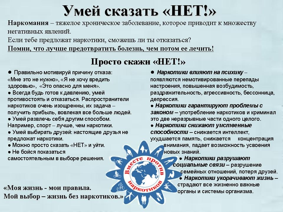 Наша общая цель – это не допустить распространения наркомании среди подростков. При этом очень важно вовремя обращать внимание на психологическое изменение в поведении детей, с тем чтобы своевременно уберечь их от вовлечения в наркосреду.