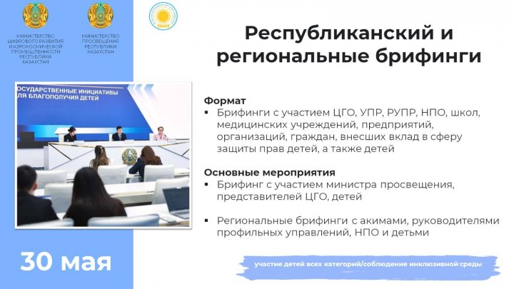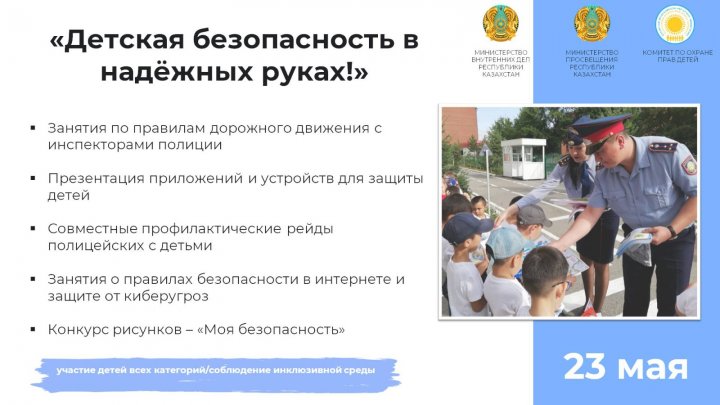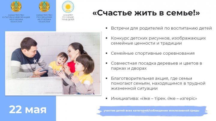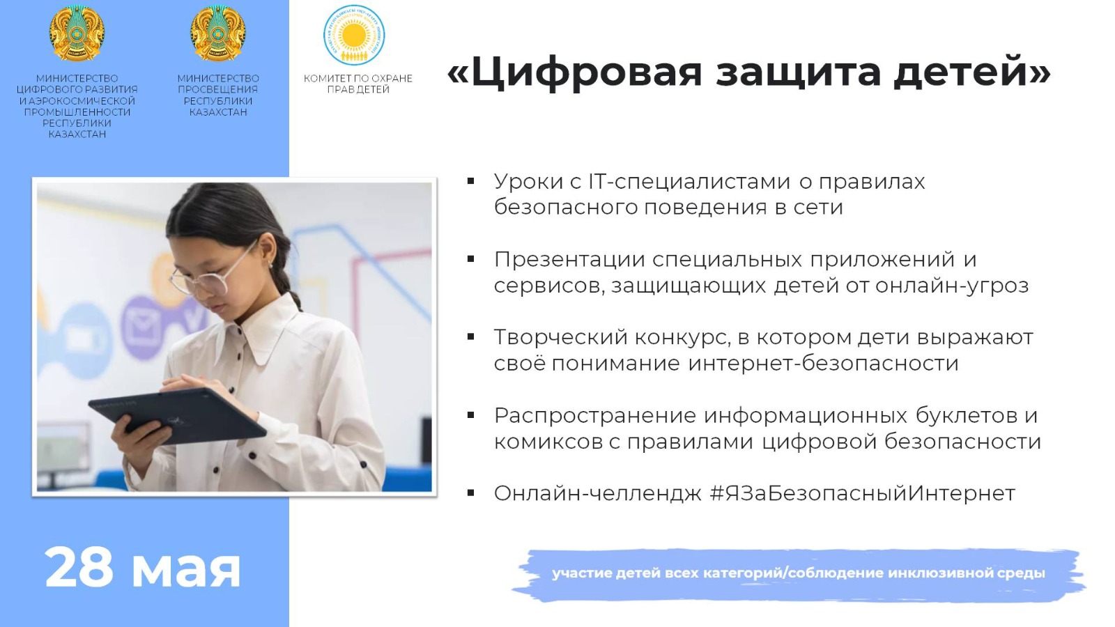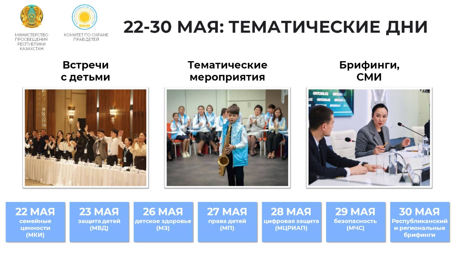 Балалық шақ мәселелері бойынша тақырыптық күндер: отбасы құндылықтары, баланы қорғау, денсаулық, балалар құқығы, цифрлық қорғау, қауіпсіздік.