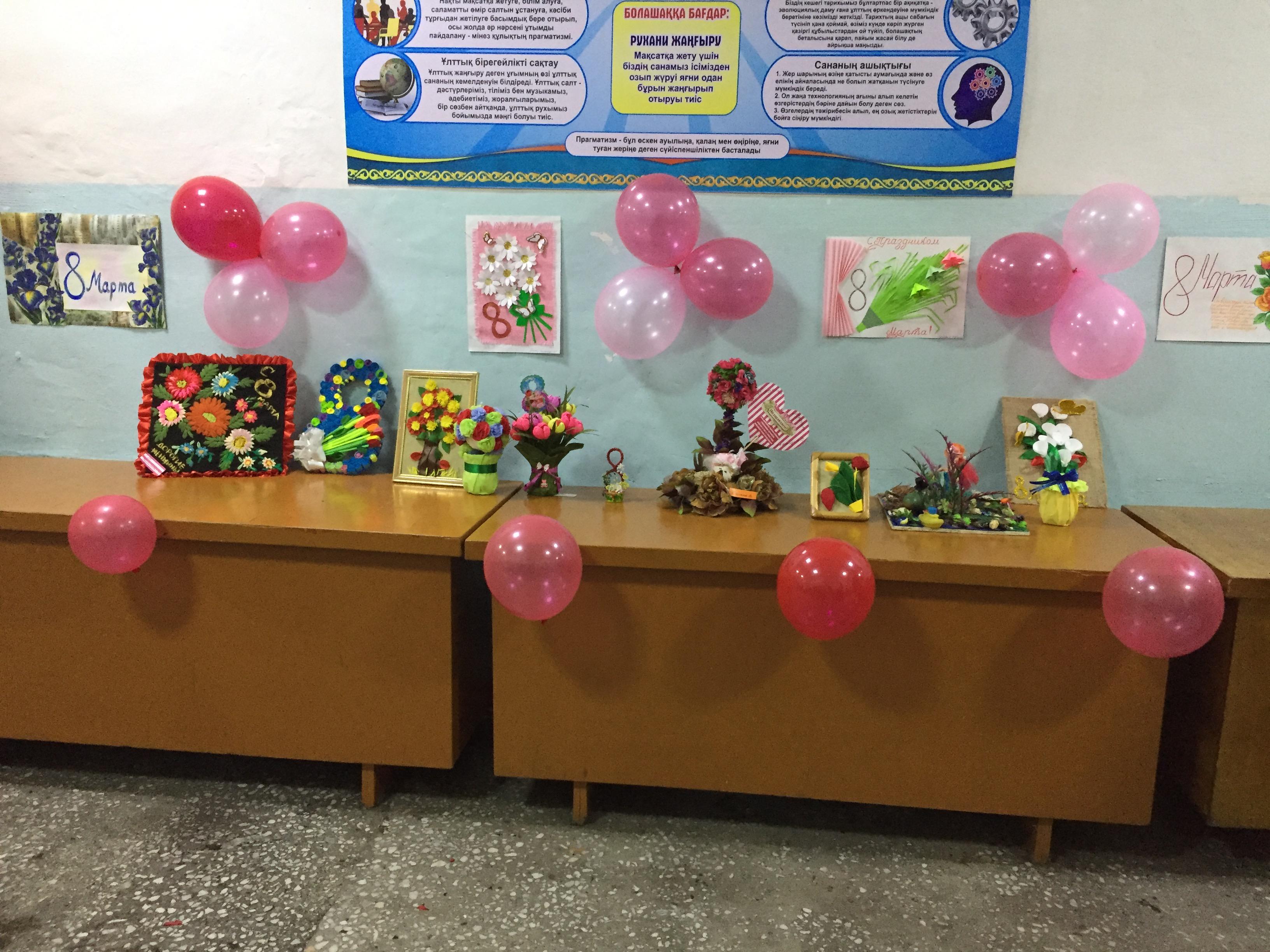 8 Наурыз күні - бұл көктем жылуы мен шынайы қуаныш сезілетін ерекше күн. Бұл күн мектебіміздің тамаша жандары - қыздар мен әйелдер қауымын құттықтайтын күн. Біздің оқушылар мерекелік көңіл-күй құрып, мектеп холлын шарлармен және тамаша бұйымдармен безендірді. Сонымен қатар мектепте осы тамаша мерекеге арналған сурет конкурсы өткізілді.